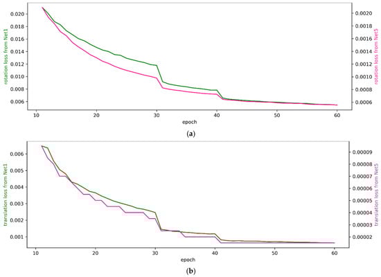 Changes in calculated losses during Net1 and Net5 training on the Oxford dataset. (a) Rotation loss calculated using Equation (10). (b) Translation loss calculated using Equation (11).
