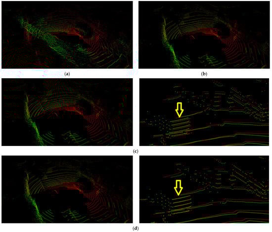 Figure 6 and Figure 7 show the results of performing calibration on the Oxford dataset using the proposed five networks. In these figures, the green dots represent the points obtained by the right LiDAR, which is considered to be the target sensor, and the red dots represent the points obtained by the left LiDAR. Figure 6a,b show the results of the transformation of a point cloud from the target sensor by randomly sampled deviations from Rg1 and calibrated parameters given in the Oxford dataset, respectively. Figure 6c shows the result of the transformation of the point cloud by inferred from the trained Net1. Figure 6d shows the result of the transformation of the point cloud by obtained after performing calibration up to Net5. Similar to the results of the calibration performed using the KITTI dataset, the results of Net1 look suitable, but they are not suitable when compared with the results shown in Figure 6d. The photo on the right side of Figure 6c shows that the green and red dots indicated by an arrow are misaligned. In contrast, the photo on the right side of Figure 6d shows that the green and red dots indicated by an arrow are well aligned. We show through this comparison that calibration accuracy can be improved by the iterative refinement of five networks even without temporal filtering.