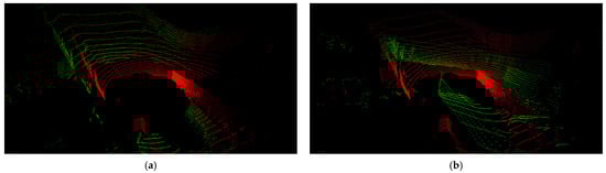 Through the experiments with the Oxford dataset, we observed that data screening is required to enhance the calibration accuracy. The dataset was built with two LiDARs mounted at the left and right corners in front of the roof of a platform vehicle. Figure 2 shows a point cloud for one frame in the Oxford dataset. This point cloud contains points generated by scanning the surface of the platform vehicle by LiDARs. We confirmed that the calibrations performed on point clouds containing these points degrade the calibration accuracy. Therefore, to perform calibration after excluding these points, we set a point removal area to [Horizon: −5–5 m, Vertical: −2–1 m, Depth: −5–5 m] for the target sensor and [Horizon: −1.5–1.5 m, Vertical: −2–1 m, Depth: −2.5–1.5 m] for the reference sensor. Experimental results with respect to this region cropping are provided in Section 4.3.1.