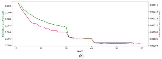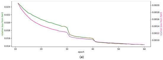 Figure 5 graphically shows the changes in the losses calculated by Equations (10) and (11) for training the proposed networks on the KITTI dataset. In this figure, the green graph shows the results of training with randomly sampled deviations from Rg1, and the pink graph shows the results of training with randomly sampled deviations from Rg5. The horizontal and vertical axes of these graphs represent epochs and loss, respectively. From these graphs, we can observe that the loss reduction decreases from approximately the 30th epoch. This was consistently observed, no matter what deviation range the network was trained on or what hyper-parameters were used. There were similar trends in loss reduction for rotation and translation. Given this situation, we halved the initial learning rate after the 30th epoch of training. Training was performed at a reduced learning rate for 10 epochs after the 30th epoch. After the 40th epoch, we halved the learning rate again. Training continued until the 60th epoch, and the result that produced the smallest training error among the results obtained from the 45th to the 60th epoch was selected as the training result. When Net1 was trained, the hyper-parameters were set as S = 5, (Vr, Vt) = (96, 160), G = 1024, (λ1, λ2) = (1, 2), and B = 8. When Net5 was trained, the hyper-parameters were set as S = 2.5, (Vr, Vt) = (384, 416), G = 128, (λ1, λ2) = (0.5, 5), and B = 4. In Figure 5, the training results before the 10th epoch are not shown because the loss was too large.