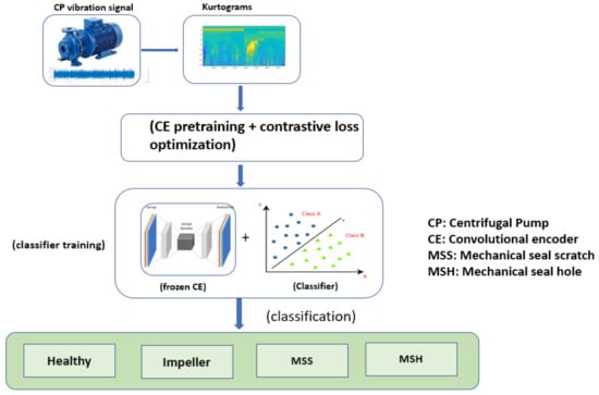 For fault diagnosis, when the features are extracted, they are usually handed over to machine learning (ML) algorithms, i.e., SVM [11], K-NN [12,13], or naïve Bayes classifiers, for classification. The mentioned ML methods result in a satisfactory classification, especially, SVM proved to provide a high accuracy in research conducted in [14]. In addition, a significant amount of research has been performed on artificial intelligence-based fault diagnosis in pumps [15]. However, the related algorithms classify data based on manually extracted features, which may not be the best for the classification of faults as it requires expertise in manual data analysis. This strategy is also very time-consuming even for experienced analyzers. It is necessary to extract features that provide the best discrimination for data from different classes. Therefore, to avoid the complications associated with conventional ML algorithms and extract the useful features, deep learning (DL) models have been used [16,17]. Deep learning is useful in fault diagnosis because of its fault features extraction and classification performance. Deep learning, with its inherent property of autonomous feature extraction, solves both the issues linked to ML models, i.e., autonomous important features extraction and time-consuming manual data analysis. Some of the deep learning techniques used for fault diagnosis include a convolutional neural network (CNN) [3] and autoencoders [18]. The CNN is the most popular DL technique used for feature extraction [19], and autoencoders are convenient for feature extraction because of their ability to compress data and form latent coding. Guo et al. [20] utilized a deep belief network (DBF) for fault diagnosis in bearings. Based on previous studies, all the deep learning techniques showed a prominent and satisfactory performance in feature extraction and classification. However, it is still possible to increase the accuracy and robustness of these models. Thus, to improve the DL model for fault classification, we introduced a supervised approach using contrastive learning, which allowed learning the contrast in data fed to the DL model. Supervised contrastive learning uses the supervised contrastive loss that pulls together samples of the same class while pushing apart samples belonging to different classes, providing better discriminance in data than other models. Therefore, supervised contrastive learning outperforms other loss functions in terms of improving the accuracy and robustness of a DL model [21]. In this work, we present a supervised contrastive learning-based DL framework for mechanical fault diagnosis in CPs. We used a CE to produce the vector representations of the input images and applied supervised contrastive loss to learn the representations of images and bring together those belonging to the same class, while moving apart those coming from different classes. A linear classifier was built with a CE having a fully connected layer accompanied by a SoftMax layer. First, the CE was pretrained without a classifier to optimize the supervised contrastive loss. The CE with supervised contrastive loss learnt the contrasting representations corresponding to the respective class; then, for the classification of CP faults, the weights of the CE were kept frozen, and a classifier (linear) was trained using the same weights of the already trained CE, while the weights of the hidden and SoftMax layers of the classifier were optimized for fault identification. The major contributions of this study are: