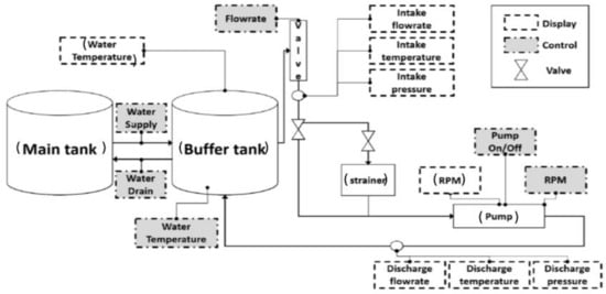 Figure 2 depicts the self-developed experimental test rig comprising a PMT-4008 CP driven by a motor with a power of 5.5 kw, a control panel that changed the flowrate, speed, temperature, and water supply, a display, and a switch. Two water tanks were used to keep a net positive suction head at the inlet of the pump. The water tanks were placed high enough to normally operate the CP. Steel pipes with pressure gauges and valves were used to connect the CP to the tanks. The schematized the testbed is displayed in Figure 3. The CP was constantly run at 1733 rpm during the collection of the vibration signals. The vibration data were obtained using several accelerometers; two were fixed on the pump case, one was installed near the mechanical seal (MS), and one was fitted near the impellers, using adhesives. Every accelerometer had its own channel to record the CP vibration data. A National Instruments 9234 device was used to digitize the vibration data. Table 1 presents the details of the accelerometer and the digitization of the collected CP vibration signals.