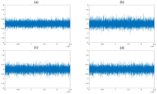 Time-domain vibration sequences in (a) normal, (b) impeller fault, (c) MSH fault, and (d) MSS fault conditions.