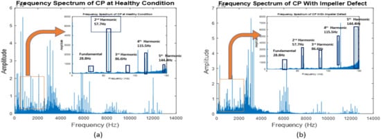 Frequency spectra of the CP under (a) normal and (b) impeller defect conditions.