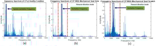 The vibration signals collected from the CP under faulty and normal operating conditions are shown in Figure 7. Figure 8 and Figure 9 show the frequency spectrums of the CP under normal, impeller fault, MSH fault, and MSS fault conditions. The defect frequencies for the impeller fault were calculated using the mathematical equations provided in [2]. It can be seen from Figure 8a,b that the amplitudes of the third, fourth, and fifth harmonics increased because of the impeller defect. Furthermore, some spikes appeared in the frequency spectrum after introducing the impeller defect. The possible reason for this is the interaction of the fluid with the faulty impeller, as can be seen in Figure 8b. In Figure 9, it can be observed that the excitation frequency under mechanical seal defects increased twice with respect to that of the normal condition. The excitation frequency is highlighted in Figure 9a–c.