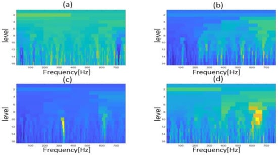 In this study, when the fast kurtogram was applied to real vibration signals, it produced a graph that displayed the spectral kurtosis of different frequency bands in the frequency domain [23]. The kurtograms computed from the CP vibrational sequences clearly showed different color regions when changing the CP operating conditions. Figure 10 depicts the kurtogram images of the vibration sequences for each CP operating conditions. The colors in each block of the kurtogram image represents a portion of the frequency, and the block width represent the bandwidth. The appearance of high-intensity colors in Figure 10b–d indicates the impulses that occurred because of different faults in the CP. These high-frequency impulses were used for fault identification by the DL models utilized in this work. The computation of these colors and bands were based on spectral kurtosis.