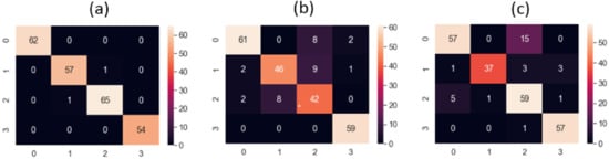For the evaluation of the performance of our method for fault diagnosis, it was necessary to organize a proper training and testing subsets of the data. This study considered a total of 1200 kurtograms, 300 for each class. The kurtograms were split randomly at a ratio of 8:2. The training set comprised 960 kurtograms, and the testing set contained 240 data samples.