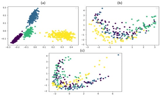 PCA feature plots of the (a) proposed method, (b) the SAE-based fault detection scheme, and (c) the DAE feature learning method.