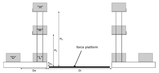 Experimental convertible setup consisting of two areas used for lifting and deposit locations. “D”, “L”, “M”, and “H” indicate the four areas available for both lifting and deposit. , , and indicate the low, middle, and high level of the load, respectively; represents the distance of a potential depth; and represents the distance between the lifting and the deposit sites.