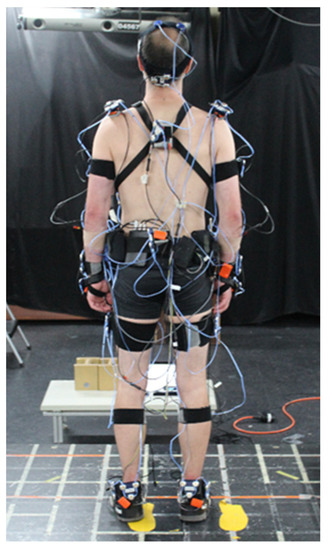 Human motion was captured simultaneously with an IMC system (XSens MVN Link, Xsens technologies, Enschede, The Netherlands) and an OMC system (Optotrak Certus, Northern Digital Inc., Waterloo, Canada). The IMC system was composed of 17 magnetic and inertial measurement units (MIMU) (head, scapulae, sternum, pelvis, arms, forearms, hands, thighs, shanks, and feet), sampled at 240 Hz (Figure 2). For the OMC system, a three-marker cluster was rigidly fixed on each MIMU (Figure 2). Eight cameras recorded at 40 Hz the 3-D coordinates of these markers. At the beginning of each experiment, the locations of 45 anatomical landmarks were identified in relation to their respective cluster. The ground reaction forces (GRF) were measured by a large homemade force platform (1.90 × 1.40 m) at 1000 Hz [34].