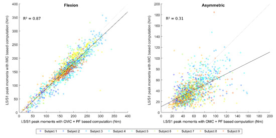 Correlations between OMC + PF-based and IMC-based computations of L5/S1 peak moments are displayed in Figure 3 and corresponding Bland–Altman plots are displayed in Figure S1. For the flexion component, the variety of MMH tasks performed resulted in peak values ranging from 12 Nm to 340 Nm for the OMC + PF-based computation, with an average of 174 Nm. For the asymmetric component, the peak values were between 14 Nm and 160 Nm for the OMC + PF-based computation, with an average of 58 Nm. The RMSE is quite similar for both components (Table 2); the coefficient of determination was higher for the L5/S1 peak moments. For both components, a bias of about −17 Nm was observed, which means that the IMC-based computation generally underestimates the OMC + PF value.