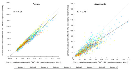 Correlations between OMC + PF-based and IMC-based computations of L5/S1 cumulative moments are displayed in Figure 4, and corresponded Bland–Altman plots are displayed in Figure S2. For the flexion component, the cumulative values were between 1 Nm·s and 640 Nm·s for the OMC + PF-based computation, with an average of 172 Nm·s. For the asymmetric component, the cumulative values were between 4 Nm·s and 195 Nm·s for the OMC + PF-based computation, with an average of 50 Nm·s. RMSE errors were found higher for the flexion component with a coefficient of determination above 0.95. Biases of about −15 Nm·s were observed for flexion and asymmetric components, which means that the IMC-based computation generally underestimates the OMC + PF value.