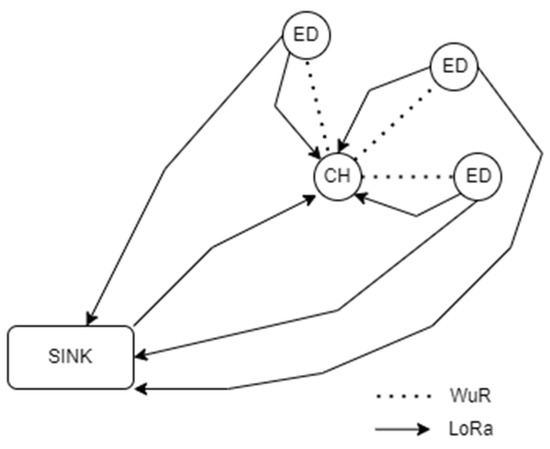 This section describes in detail the architecture of the network that was adopted, as shown in Figure 1. To begin with, we are referring to a heterogeneous network consisting of three different types of nodes: the EDs, the CH, and the SN. The SN is the most important type, being unique in the network. It is the node where all the data are being gathered. The EDs are nodes equipped with different kinds of sensors that collect data and transmit them to the SN, and lastly the CH is the means of communication between the EDs and the SN. In the network, the EDs are split into one or more clusters, with every one of them having its own CH. Both CHs and EDs are equipped with a LoRa and a WuR transceiver [12,13,14,15]. Contrariwise, the SN is equipped only with a LoRa transceiver.