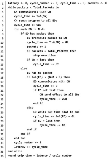 This results in significant delays in scenarios where not every ED has a packet to transmit, because the time slots cannot be updated dynamically, and the network waits for an empty transmission slot. The slot size is determined by computing the time-on-air () using the above equation (see Appendix A) for the LoRa data packet depending on the payload size, with a pre-defined guard time () of 6 ms, and , which is the ID of each ED. The guard time guarantees that the window is large enough for the transmission and compensates for clock drift, which may be detrimental with an increasing number of EDs. Finally, the EDs start transmitting the data packets to the SN over the LoRa module, according to the slot schedule, as illustrated.