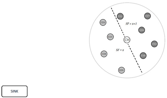 Firstly, the proposed algorithm (Figure 2) is aware in advance of the distance of every one of the 9 EDs and the CH from the SN, so it can use the most efficient SF possible (Table 2). We consider that in every scenario there will be at best two different SFs. That is true because we are aware of the operational range of LoRa being about 20 km. If we divide the LoRa range in six discrete SF zones (from 7 to 12), every zone has a radius larger than the previous one by about 3.333 km, and considering the range of WuR, which is 3 km, we end up with two SF groups that all the EDs in a cluster belong to. The first group will have from none to all the EDs and will operate with , and the second group will have the rest of the EDs and will operate with (Figure 3). With that change we manage a smaller mean data latency, especially with the larger SFs due to the difference in time-on-air (ToA).