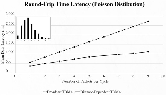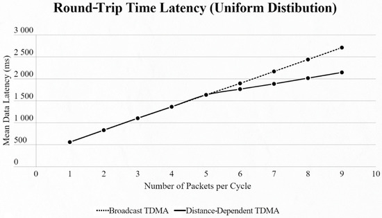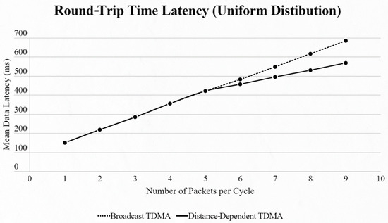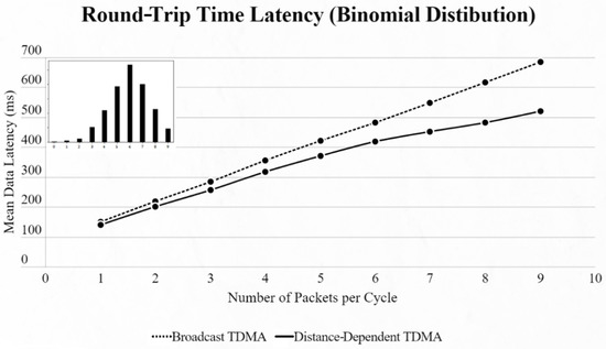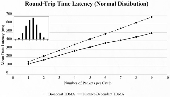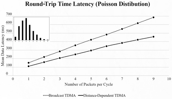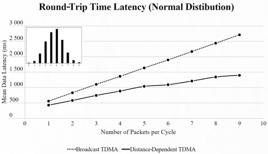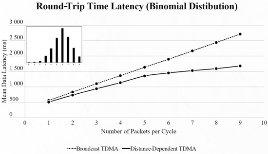 This section presents the simulation results for the Distance-Dependent TDMA protocol, to assess its improvement in mean data latency over the implementation of [4]. The parameters for the simulation runs are presented in Table 3. There was some energy efficiency testing as well. It should be noted here that the mean data latency pertains to the round-trip time latency, which in turn is computed as the time difference between the SN transmitting the initial LoRa message to the CH and receiving all LoRa messages from the EDs. The energy measurements are based on [4] as well, using a 1200 mAh lithium polymer battery at 3.3 V and the power consumption numbers that Piyare uses. Both protocols have been implemented using Python 3.8 (Python Software Foundation, Wilmington, DE, USA) on a Jupyter Notebook (4.9.1, Professor Fernando Pérez, UC Berkeley, CA, USA) running Windows 11 with AMD Ryzen 5 5600 H. Two network architectures were simulated at four different network load situations. The network shape in Figure 6 is mutual for both networks and only the distances of the nodes vary (Table 4 and Table 5). Both networks were tested with packets following: (i) Uniform distribution, (ii) Normal distribution, (iii) Binomial distribution and (iv) Poisson distribution.