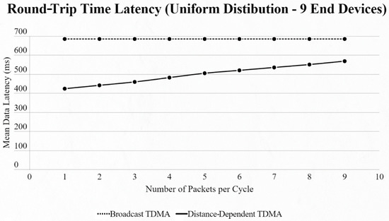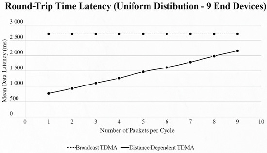 On the other hand, if we use the uniform distribution again but with a fixed number of 9 EDs in the network and our testing variable is the number of packets transmitted per cycle, we notice that [4] has a steady mean data latency regardless of the changes, as the algorithm cannot sense if an ED has a packet or not, in contrast to our approach, which has a linear increase thanks to ED and CH communication (Figure 9 and Figure 10).