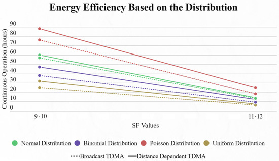 Lastly, we compared the energy efficiency of this approach over Piyare’s. The results presented below were exported using a unique method. We used the battery capacity of 1200 mAh operating at 3.3 V, exactly like Piyare. That gives us a 3.96 Wh battery. In the testing method we took the average power consumption of all 9 EDs of the network and we constantly ran simulations. There were no pauses, meaning that at the end of each cycle the SN immediately started a new one, and we measured how many hours the average ED would last for every distribution until its battery ran out. We can clearly distinguish (Figure 17) that in every scenario our protocol manages to outperform Piyare’s approach concerning the endurance of the network in a continuous mode. If we consider that each cycle will happen with an inter-packet interval of 10 s, as Piyare used for his simulations, the improvement is significant.