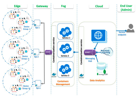 The communication of sensitive data generated by multiple sources occurred in high velocity at high volumes. It was managed by messaging hub techniques provided by the MQTT (message queuing telemetry transport) protocol. The aforementioned multiple layering entry allowed a manager to define communication channels for applications. It reduced the intra-service network overhead. The message broker module was included at each layer in the Docker container.