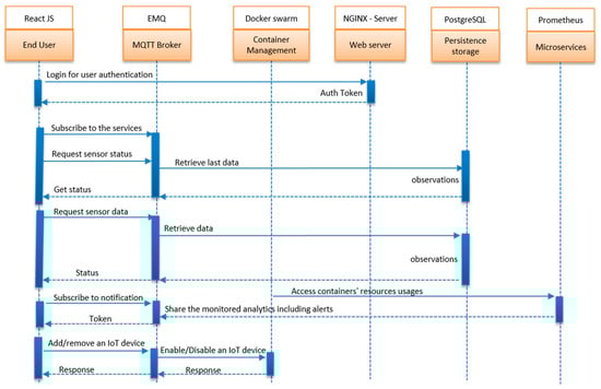 Data transmissions were considered by ensuring data transfer in real-time using MQTT-based protocols, along with data packaged in JSON format—which has been considered lightweight—to ensure low network bandwidth consumption. For services, scalability, and reusability, the container-based and microservices solution was proposed, using Docker. It satisfied the horizontal scalability of the framework. The sensor nodes, considered Docker workers for updating and easy connectivity, were under the control of the Docker Swarm manager. Data sent from sensor nodes were managed by the Nginx web server, which also acted as a load balancer in case of the huge amount of user requests coming from the front-end.