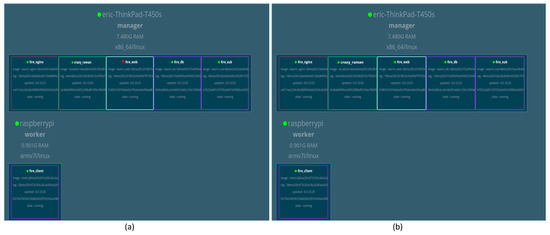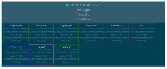 This proposed scheme was designed such that, in highly dynamic distributed systems, the management of multiple deployed sensor nodes and their resources could be achieved efficiently. The role of the manager (Docker Swarm), shown in Figure 2, was to ensure the most efficient resource allocation possible by keeping track of service deployment. It was able to manage sensor node groups and allow system scale-up, and updated as many containers as possible in clusters of machines.