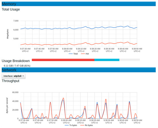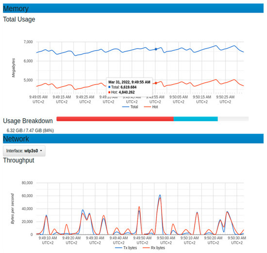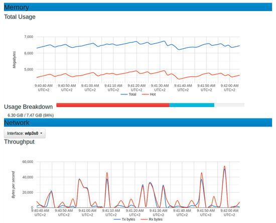 On the graph of throughput, the dominant operation was the reception as the data were being sent from the sensor node to the platform. The observed maximum value of the reception was 46,000 bytes per second. It showed a minimum of around zero at some specific period. The presence of some points with zero throughputs could depend on the sensor node device set to send data at an interval of 5 s. The maximum memory usage in this configuration was around 4600 megabytes, while the minimum was around 4200 megabytes. This implied that the average usage of 4400 megabytes of memory.