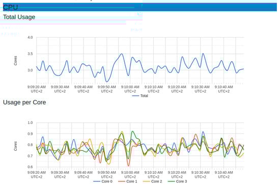 Figure 19 visualizes the memory and CPU usages in the scaled 3 nodes, using 1000 generated requests. The graph of memory usage showed that the increases in requests could increase the amount of consumed memory, but for the time being, there was no increase. The CPU usage graph showed that, while at the time, there was a small increase in usage, this increase may have depended on the internal cooperation of all container services involved in the data processing.