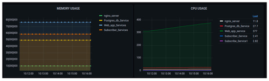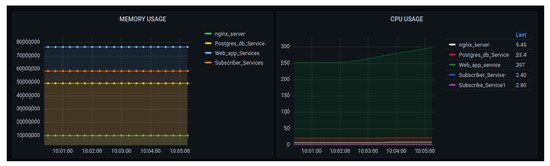 Figure 21 shows the visualization of the system after increasing the number of requests up to 1,000,000. The graph shows that CPU and memory did not change significantly, but the trend increased compared to Figure 19.