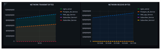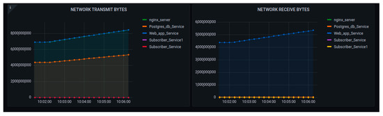 The performance metrics were concerned with the transmission cost of the network as shown in Figure 20. The main point of tracking those parameters was to observe how the internal containers were costly while exchanging message requests. In network transmission, the busy container was cAdvisor, as it was concerned with the huge number of requests being generated.