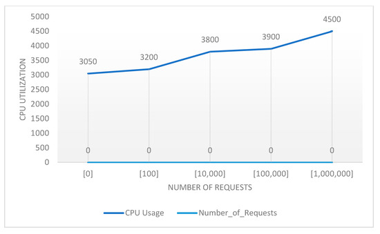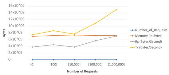 Figure 23 shows the CPU usage performance, while Figure 24 visualizes the performance of the system in terms of memory usage and network transmission. The graph summarized the details shown in Figure 19, Figure 20, Figure 21 and Figure 22. It was observed that the memory did not increase in consideration of the increase of the requests, as seen in the observations detailed in the above figures. The network transmission at the receiver side (Rx) did not increase much as the experiment performed was aimed at generating requests to be sent to the platform. Generating requests trying to access the generated data was out of the scope of this research.