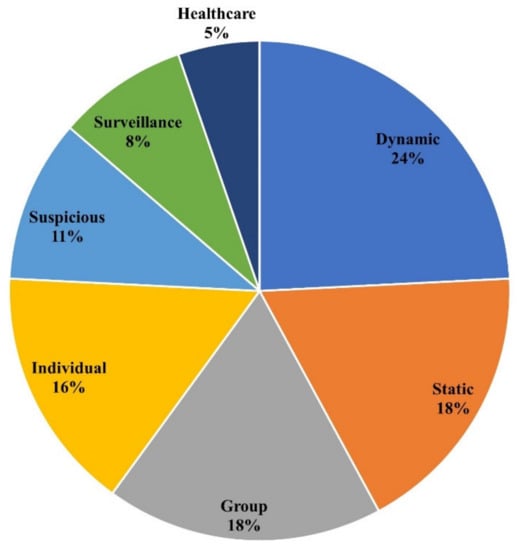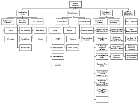Human activity is defined as the sequential action of one or more people. HAR is the task of automatic detection and identification of human activities using various state-of-the-art techniques [5]. The activities can be indoors, such as sitting, lying down and walking as well as outdoor activities such as playing football or horse riding. In the literature, HAR is being used for different application areas [6]. This study organized existing literature on HAR under three categories including daily living, real-time and user activities. The daily living activities are further classified into static activities such as standing or sitting and dynamic activities such as walking or running. The studies that explored real-time activities are grouped under healthcare, suspicious and surveillance. Finally, the studies related to user activities are grouped into individual and group activities. It is interesting to note that majority of existing studies reviewed in this study are classified under daily living and user activities, while very limited studies are related to real-time activities.