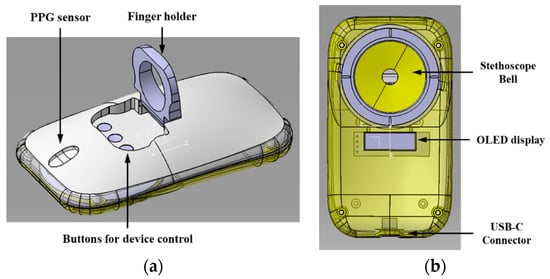 The goal of this study is to develop a smart stethoscope that can be held by one hand to measure heart sounds and pulses simultaneously. Therefore, the reference for the shape of the proposed smart stethoscope was taken from a standard PC mouse because of its perfect grip and appropriate size suitable for use by every individual [12]. Figure 1a shows the design of the shape of proposed multimodal technology-based smart stethoscope for personal cardiovascular status monitoring. The size of the device is set as 10 × 5 × 3 cm, which is the standard size of a PC mouse, so that it can be held comfortably with on hand. In addition, a folding finger holder similar to a smartphone ring grip is provided because the users have to hold the device and attach it to their chest by themselves. It is designed at the center of the device so that it is easy to fasten the finger during time-consuming measurements. For pulse signal measurement, a hole is made in the middle of the PPG sensor to closely approach the first segment of the finger (distal phalange). When the user inserts the finger into the finger holder to grasp the device, the finger is guided onto the PPG sensor hole to measure the pulse directly. In addition, three push switches are designed under the finger hole for on/off device power and mode selection.
