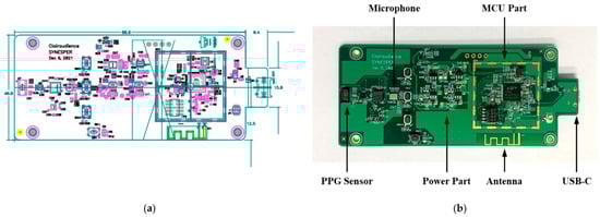 Figure 2 shows the proposed multimodal smart stethoscope PCB artwork design and manufactured PCB. The size of the PCB is designed to be 98 × 40 × 1.6 mm with a single-layer PCB structure. Except for the battery socket, the top surface consists of all the electrical elements of the sensor, power supply, and control communication parts, as shown in Figure 2a. Because the microphone sensor is a bottom port microphone, the microphone is placed on the upper of the PCB, and a small hole runs through the PCB that connects with the sensor directly to pass the sound vibration from the stethoscope bell. To improve the strength of wireless communication and decrease the dimensions of the PCB, an interdigital shape pattern antenna is designed for Bluetooth communication at 2.4 GHz frequency. A shading line was also intended to encase the RF elements that isolate the noise occurring from other electrical components to affect the wireless communication. At the bottom of the PCB, a 0.91-inch OLED dot-matrix graphic display screen consisting of 128 segments and 64 commons was selected and fixed on the PCB for pulse signals and heartbeats display. The display was driven by a single-chip CMOS OLED control driver and connected to a microprocessor unit via an inter-integrated circuit (I2C) interface. A 4.7 V 350 mAh Lithium recharge battery with a high-speed recharging circuit was designed for power supply. In addition, to increase the usage time, the operating voltage of the microprocessor and sensors was set to 1.8 V, which is the minimum value for most of the semiconductor elements. In addition, the USB recharging connector was upgraded to C type owing to its popularity and rich connection support for future improvement. The manufactured PCB is illustrated in Figure 2b.