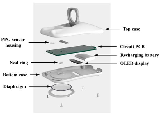 The cardiovascular system is the most complex system in the human body, that includes the heart, blood vessels, and blood. However, existing personal cardiovascular monitoring devices, such as stethoscopes, Holter, and health bands, can measure only one type of signal from the cardiovascular system. Therefore, for cardiovascular disease diagnosis, the acquired data from these devices can only be used as a reference for initial screening and are not suitable for diagnostics. To improve the accuracy of existing methods and identify novel approaches for the diagnosis of cardiovascular diseases, wearable devices based on multimodal technology were developed for measuring heart sound, ECG, and pulse simultaneously; however, analysis of their interrelationship has been reported in several studies [9]. Kulm et al. presented a heart sound and ECG signal acquisition device using a multimodal ECG system along with a stethoscope at the back of the device for simultaneous data recording of the heart. However, the device has to be fixed on the skin of the chest surface using Ag-cl electrodes and size of the device without a battery is 60 mm × 70 mm × 6 mm, which is not suitable for daily use [10]. One of our previous studies also presented a multimodal technology-based smart stethoscope with a folding finger-ring shape design to simultaneously measure heart sound and pulse signals [11]. Owing to the finger-ring shape, the developed device can be worn on the user’s finger and placed on the chest to measure heart sounds and PPG signals simultaneously. This is convenient and suitable for daily use. However, the circuit of the device was separately mounted on two printed circuit boards (PCBs) due to the folding structure design, which resulted in the breakage of connection cables when the device was folded repeatedly for opening and closing. In addition, the size of the finger hole was fixed; therefore, it was not suitable for all users.