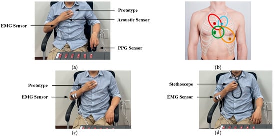 Pictures of the experimental setup for evaluating the performance and usability: (a) Photo of a subject in the performance test of physiological signal measurement; (b) auscultation positions; (c) EMG measurement with the prototype; (d) EMG measurement with a standard stethoscope.
