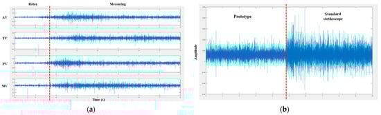 Example of EMG signals in performance and usability tests: (a) EMG signals for heart sound at four measurement positions; (b) EMG signals comparison between prototype and standard stethoscope.