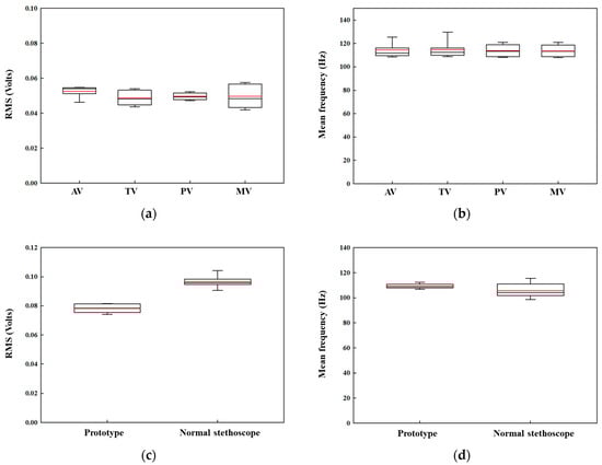 Figure 5c,d show the second experiment conducted to evaluate the users’ muscle fatigue levels. The values obtained are compared for the proposed smart stethoscope and standard stethoscope. The subject was required to use the prototype and a standard stethoscope to measure the heart sound for 30 s each. Electrodes of the EMG sensor were attached to the outside of the right arm to measure superficial EMG signals. The data measured by the prototype and MP160 during these experiments were transmitted to a high-performance PC via Bluetooth and serial communication, respectively, for data storage and processing.
