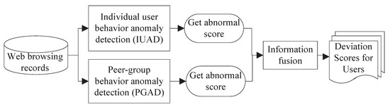 We propose an insider threat detection system that builds a fusion model from user web browsing behavior. The overall structure of the proposed model is illustrated in Figure 1. The model mainly contains three components that are named individual user behavior anomaly detection (IUAD), peer-group behavior anomaly detection (PGAD) and information fusion. We get abnormal scores from the first two components, and then fuse them to obtain the final abnormal scores in the third component.
