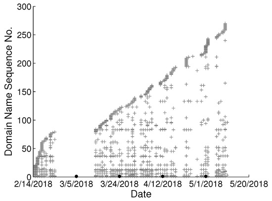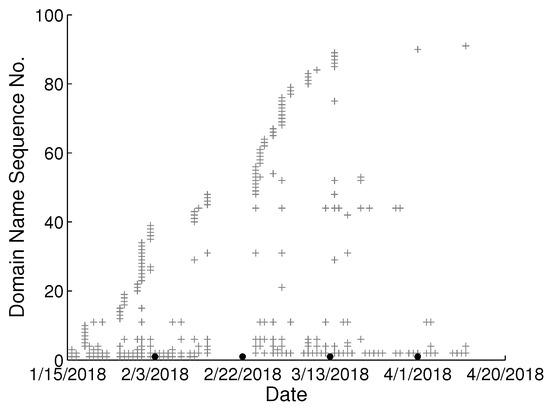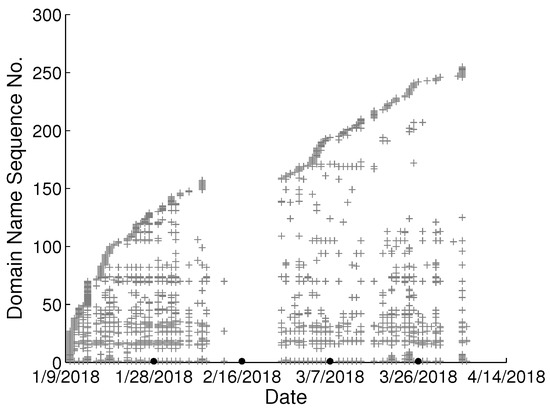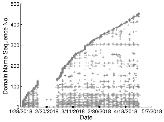 To study the behavioral change pattern of the individual user, we collect web browsing records from 4 users in our lab over the months of January to May 2018. The domain names visited in chronological order are presented in Figure 2, Figure 3, Figure 4 and Figure 5. We use various sequence numbers to denote different domain names. Horizontal axis represents the date and the vertical axis is the corresponding domain name sequence number visited on that day. The same sequence number in vertical axis of two sub-figures may represent the different domain names. A period without records occurs in every sub-figure due to winter vacation of our lab. From the figure, we can see new domain names are generated every day for each user and we assume the rate of generation is continuous and user-specific. Based on this assumption, we model the dynamics of visited domain names by each user as a power distribution. Consequently, the emerging domain name sequence number in the tth time period can be written as: