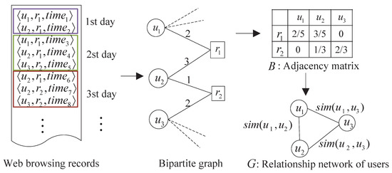 In order to obtain the distance between users, the users and visited domain names firstly are mapped onto a bipartite graph, such that users and domain names are modeled as vertices, and an edge represents the number of times that a user accessed the domain name. We summarize the information in this bipartite graph of users and domain names in an adjacency matrix B of size , such that cell