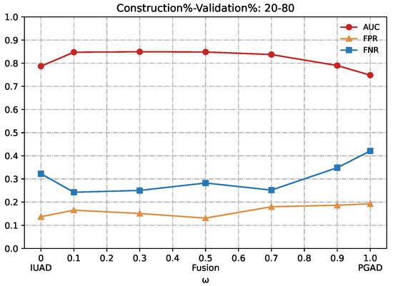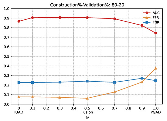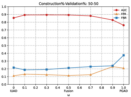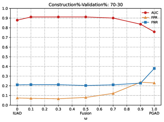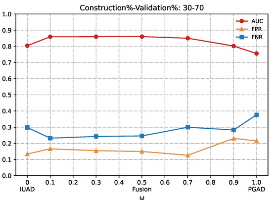 We can clearly appreciate in Figure 7, Figure 8, Figure 9, Figure 10 and Figure 11 that the combination based on IUAD and PGAD supersedes single IUAD and single PGAD. AUC, FPR and FNR are the metrics compared in each of the graphs. We can see the metrics achieve best when the combination rate w is set to 0.1 and 0.3 whenever the amount of available training in different graphs.