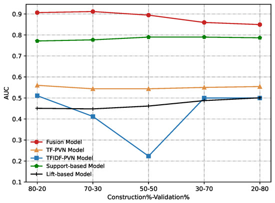 Comparative results of the Fusion model, TF-PVN model, TFIDF-PVN model, Support-based model and Lift-based model in terms of AUC.