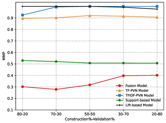 Comparative results of the Fusion model, TF-PVN model, TFIDF-PVN model, Support-based model and Lift-based model in terms of MMP.