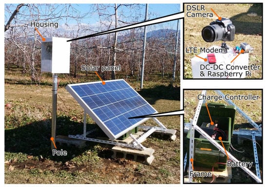 To periodically capture images from a fixed point at an apple orchard without a commercial power supply, we developed an image monitoring device that operated autonomously, based on previous research [4]. The setup of the monitoring device and its structure are shown in Figure 1. This device was powered through a solar panel (140 W, Looop Inc., Tokyo, Japan) and charged a 12 V battery (G&YU SMF31MS-850, Global Battery Co., Ltd., Korea) via a charge controller (LP-12/24V50A_2.0, Looop Inc.). Two DC–DC converters, via a charge controller, converted the electric power to 5 V and 7.4 V and supplied a microcontroller (Raspberry Pi 2 Model B, Raspberry Pi Foundation, Cambridge, UK) and a digital single-lens reflex (DSLR) camera (EOS Kiss X7, Canon Inc., Tokyo, Japan). Images captured with the DSLR camera were temporarily stored on the microcontroller and then transmitted to a web server via a USB long-term evolution (LTE) modem (L-02C, LG Electronics Inc., Busan, Korea). The microcontroller performed actions such as acquiring images with the DSLR camera and transferring them through the USB LTE modem.