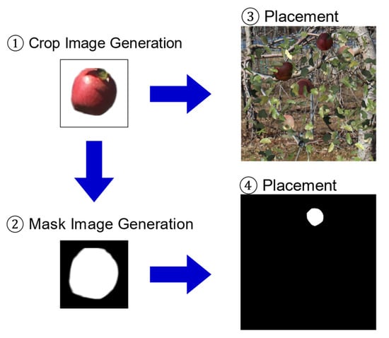 Object detection in deep learning requires a large amount of training data, and such training using existing large-scale datasets is common. However, in fruit tree images, it is desirable to detect fruit regions hidden behind branches and leaves, but there are no existing trained models that can detect hidden regions. In this paper, we propose a method to automatically generate a large amount of training data using images obtained from the monitoring system. Songyan et al. [22] showed that data expansion is possible by applying the cut-and-paste method. In this study, the cut-and-paste method is used to automatically generate training data. The training data consist of a synthetic image of a farm and binary mask indicating the fruit area. Figure 2 shows the process of generating the synthetic images.