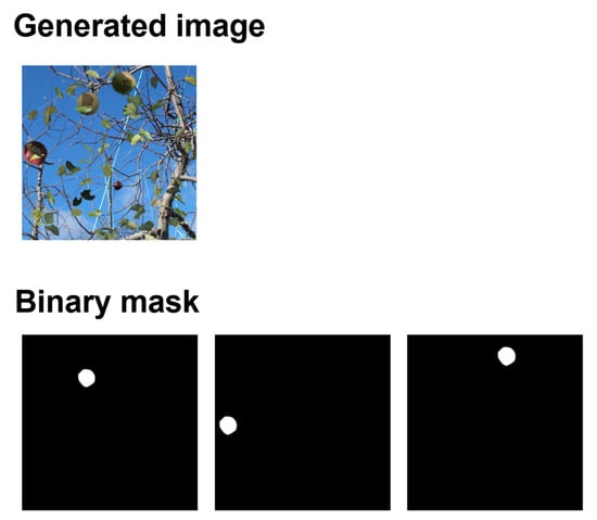 The shape was extracted from the leaf image, and an image with low luminance was composited over the fruit image as a shadow of the leaf. For the shadow images, the aspect ratio, magnification, and angle were also varied to represent shadows of various shapes. The examples of the generated training data are shown in Figure 3, and the binary mask and generated image are shown in Figure 4. From Figure 4, in the generated image, we can observe that the fruits were placed at the white positions on the binary mask.