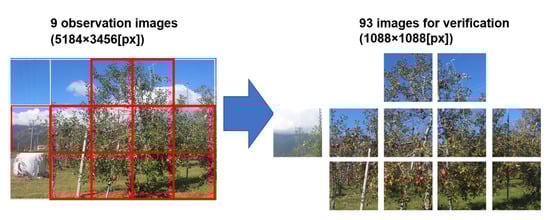 Generation of images for verification from observed images. Nine images (5184 × 3456 [px]), one for each day, were selected from the period 11 September to 20 November 2018, as images for validation data. Since the proposed model requires 1088 × 1088 [px] images as input data, each original image that is 5184 × 3456 [px] was cut and separated into 11 sections, generating 99 images with a resolution of 1088 × 1088 [px]. The 93 images were used as validation images because 6 of the images had no fruit.