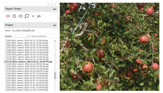 As the proposed model requires 1088 × 1088 [px] images as input data, each original image that had a resolution of 5184 × 3456 [px] was cut and separated into 11 sections, generating 99 images with a resolution of 1088 × 1088 [px]. Subsequently, excluding the 6 images in which the fruit was not visible, the remaining 93 images were used as validation images. Annotation of the regions was done manually using the VGG Image Annotator (VIA). VIA can output the fruit contour in JSON format by enclosing the fruit region in the image (Figure 7).