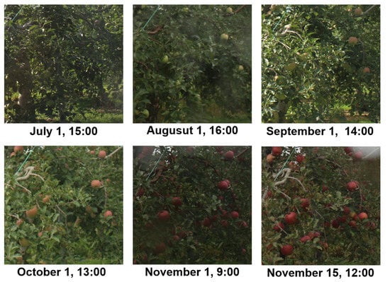 - Genno, H.; Kobayashi, K. Apple Growth Evaluated Automatically with High-Definition Field Monitoring Images. Comput. Electron. Agric. 2019, 164, 104895. [Google Scholar] [CrossRef]