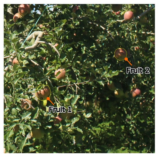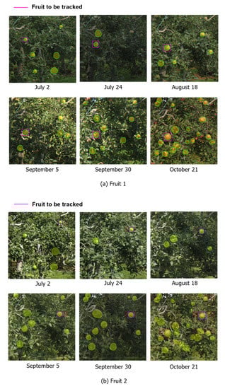 Precision agriculture involves detailed observation, control, and planning of farmland and crop conditions, and substantial research on precision agriculture has been conducted to improve productivity by using information and communication technology and the internet of things to understand the growth conditions of agricultural crops [1,2,3]. Kobayashi et al. [4] developed a high-resolution image comparison system to extract crop growth information by observing the changes in their appearance. In addition, Genno et al. [5] predicted the fruit radius from apple growth curves based on the green-blue vegetation index leaf area in apple orchards. In Genno et al.’s study [5], the entire fruit tree was evaluated based on a single growth curve, while growth curves for individual fruits were not obtained. More precise management would be possible if the growth of individual fruits could be predicted.